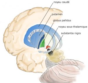 L’auteur résume la fonction des noyaux gris centraux (structure détaillée dans la figure ci-contre) de la manière suivante : ils servent à l’intégration et l’harmonisation des émotions, des pensées et du mouvement. La personne va avoir une réaction au stress inversement proportionnelle à celle des noyaux gris centraux. Les TDHA ont leurs noyaux très peu actifs, donc l’intégration est insuffisante, un rien les fait réagir. Leur écriture sera elle aussi agitée (ils s’en sortiront moins bien avec des polices cursives).